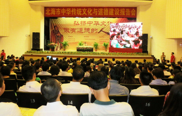 北海市中華傳統(tǒng)文化與道德建設(shè)報(bào)告會(huì)以弘揚(yáng)中華優(yōu)秀傳統(tǒng)文化,做有道德的人為主題,由全國道德模范、感動(dòng)中華人物,愛崗敬業(yè)標(biāo)兵,社會(huì)愛心企業(yè)家等組成的中華文化弟子規(guī)匯報(bào)團(tuán)前來作專題報(bào)告講座。報(bào)告團(tuán)的代表們用自己的身體力行的感人事跡和改過懺悔的心路歷程詮釋中華文化忠孝美德,將中華優(yōu)秀傳統(tǒng)文化與時(shí)代精神相結(jié)合,真實(shí)再現(xiàn)了“百善孝為先”這一亙古不變的做人根基。