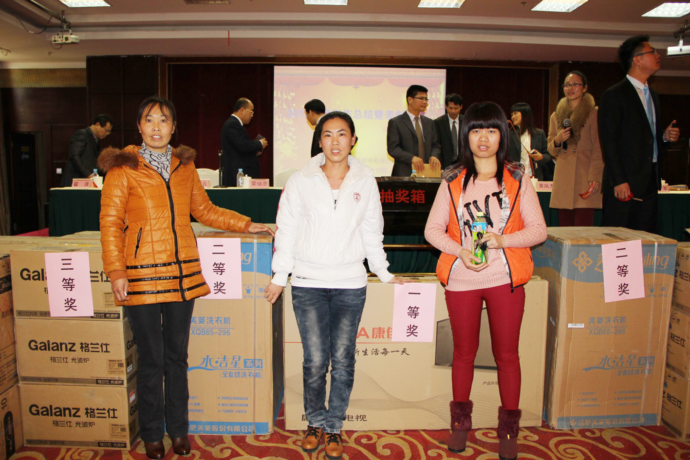 全體員工在年度總結(jié)會上參與了公司組織的幸運(yùn)抽獎。獎品有一等獎1名,獲得46寸大屏液晶電視機(jī)1臺;二等獎2名,每人獲得1臺洗衣機(jī);三等獎15名,每人一臺微波爐;有40名員工分別獲得幸運(yùn)獎,每人一臺電飯煲。