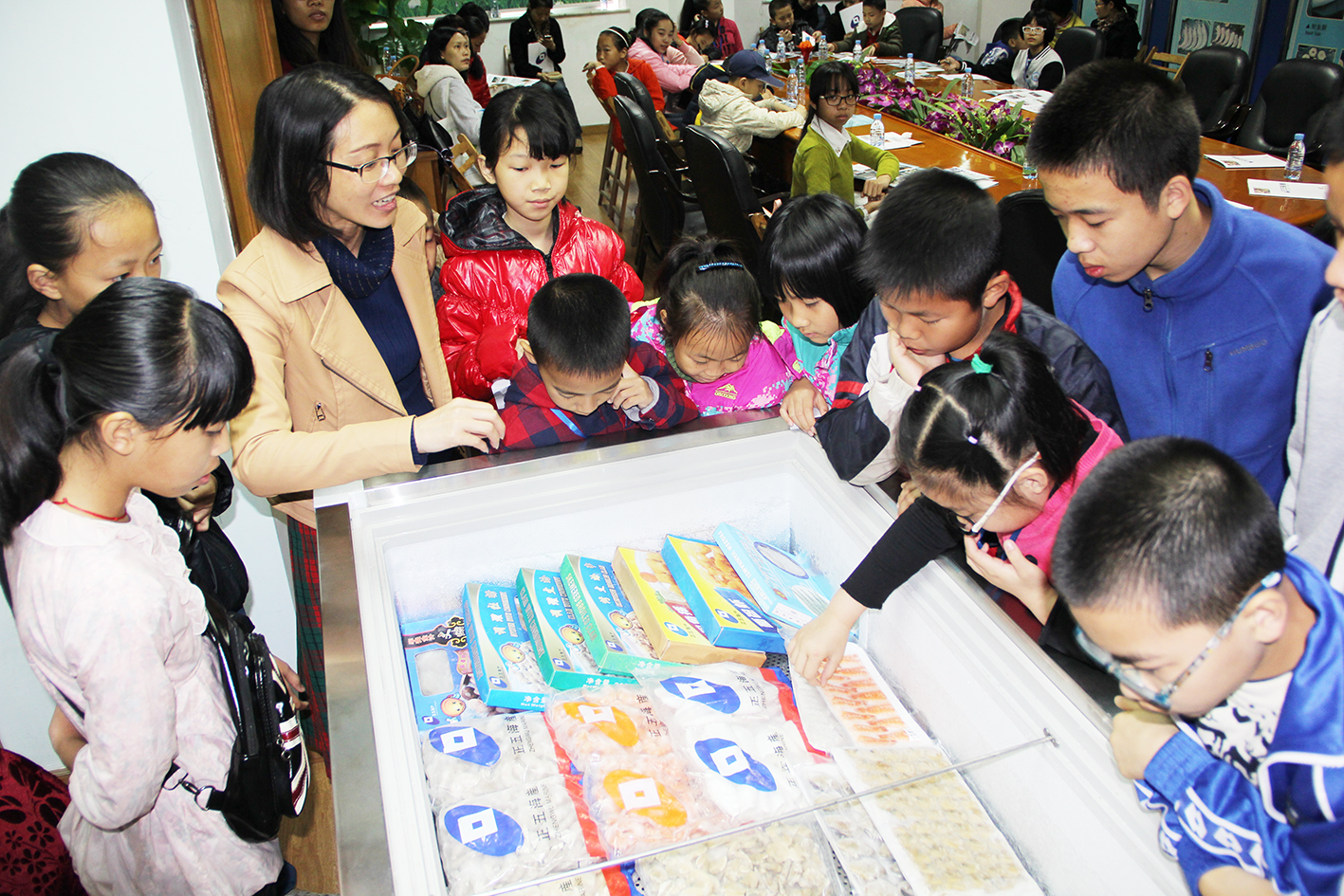 在會議室內(nèi),小記者們觀看了正五海產(chǎn)公司的宣傳片,參觀了正五海產(chǎn)公司產(chǎn)品展示柜。為了讓小記者們切身感受正五海產(chǎn)公司“以人為本,科技興企”的企業(yè)文化,公司工會主席包菊輝詳細介紹了公司的經(jīng)營項目、發(fā)展方向、企業(yè)文化等情況。在答記者問環(huán)節(jié),小記者們對包菊輝展開了“專業(yè)”采訪。小記者們生動有趣的提問,包菊輝通俗簡單的回答,讓專業(yè)水產(chǎn)行業(yè)知識變得淺顯易懂。